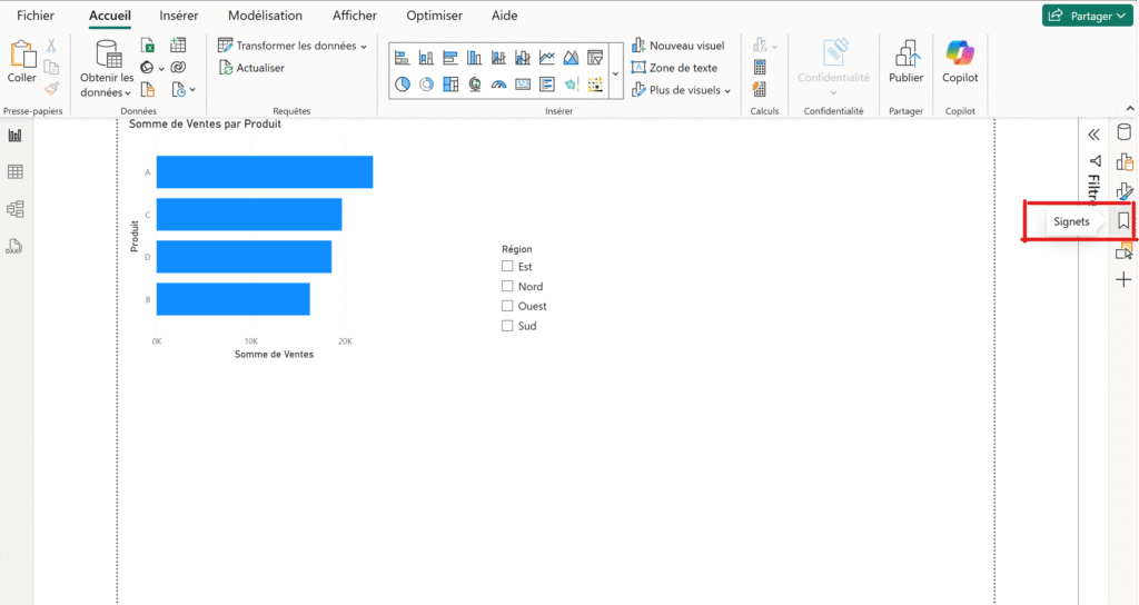 Un signet capture l’état d’une page Power BI. Il enregistre les filtres, les visuels et l’affichage à un instant donné. Vous pouvez ainsi revenir à cette vue en un clic.
