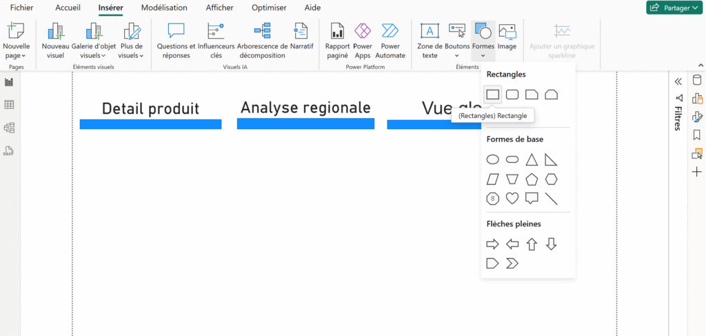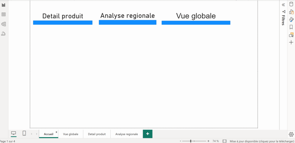 Crée 2 ou 3 pages dans Power BI : par exemple "Vue globale", "Détail produit", "Analyse régionale".