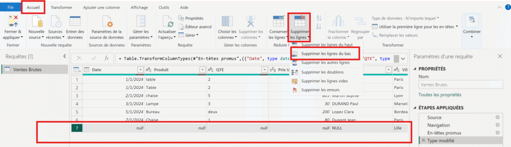 Nettoyer et transformer : l’éditeur Power Query s’ouvre. Vous pouvez :