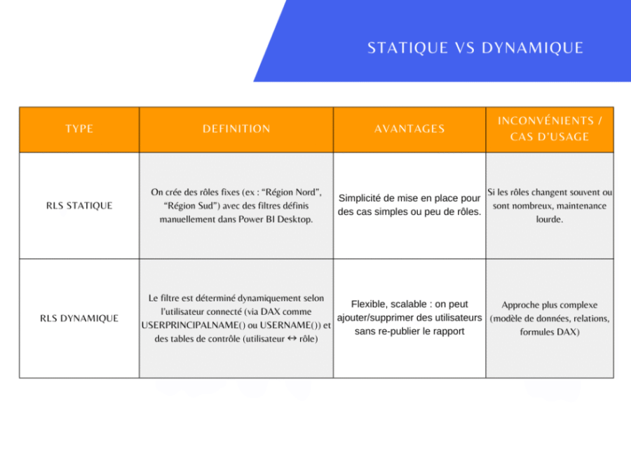 La RLS statique est simple à mettre en place mais peu scalable ; la RLS dynamique est plus puissante et flexible, adaptée aux organisations avec de nombreux utilisateurs.